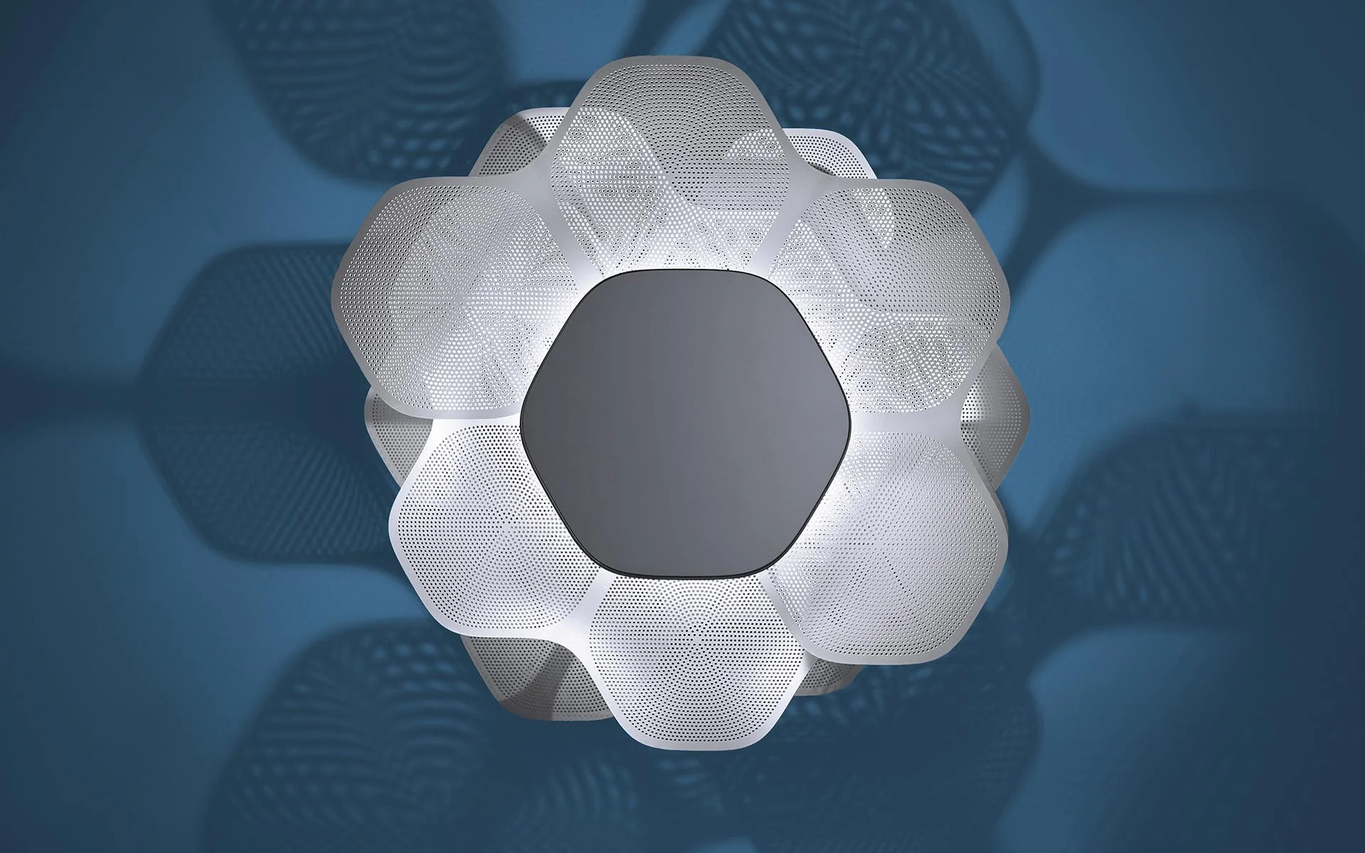 The hexagonal hole matrix surface allows light to both reflect and be absorbed through each layer. Made out of anodised aluminium, each layer’s outline is optimised for nesting and laser cut from a single sheet of metal with the minimum waste of material.